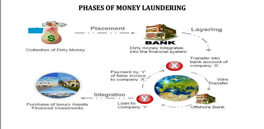 - Integration: Reintroducing laundered funds into the legitimate economy. Examples include: