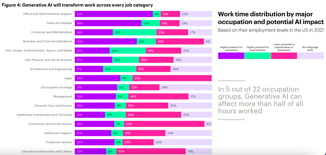 - In the service sector, AI’s impact is just as significant. The use of chatbots and virtual assistants is expected to augment human roles rather than replace them, with a Gartner report estimating that by 2021, AI augmentation will generate $2.9 trillion in business value. Jobs in customer service have transformed, with AI handling up to 80% of all customer interactions, according to a Salesforce study. This shift requires customer service professionals to manage more complex inquiries and oversee AI operations, reshaping the nature of service jobs towards higher-level customer engagement and technical oversight.