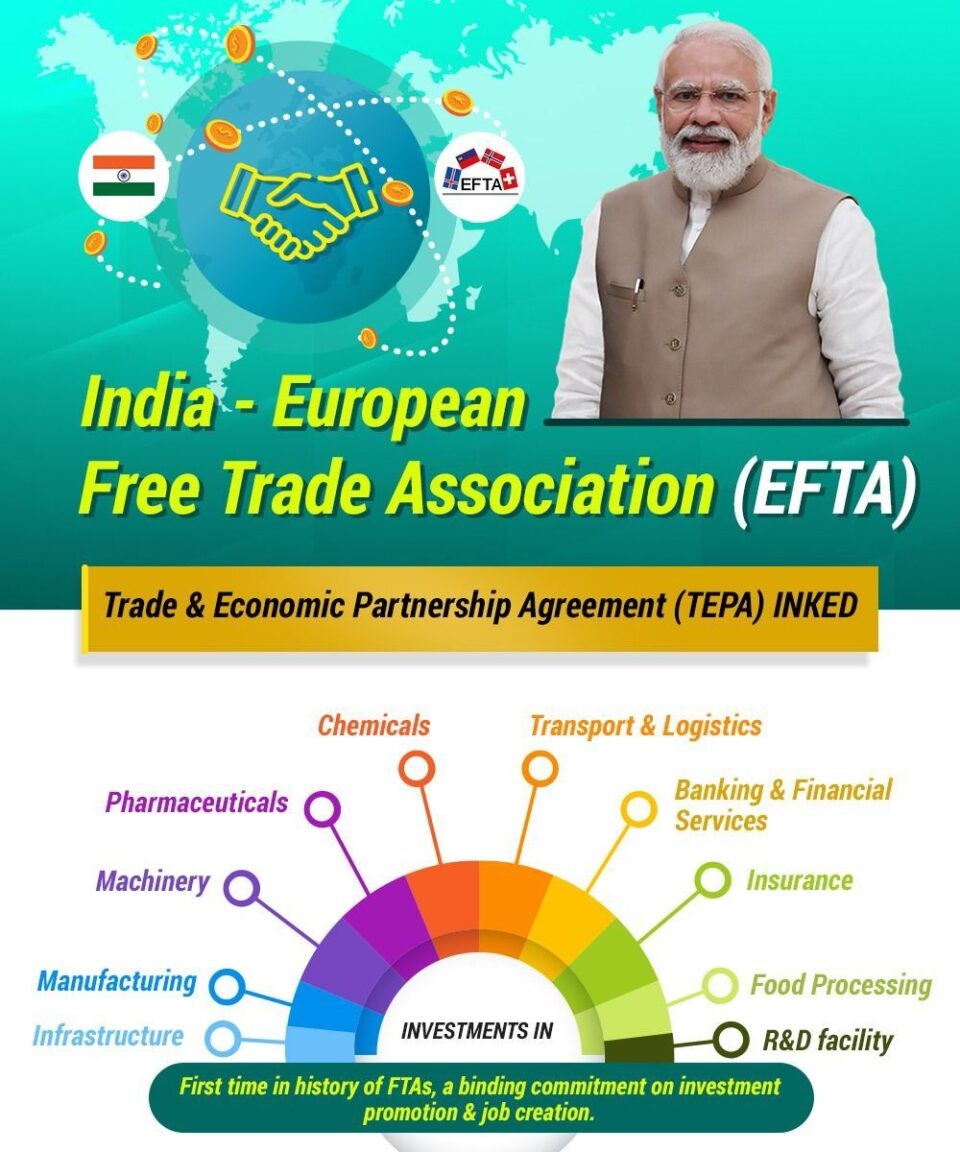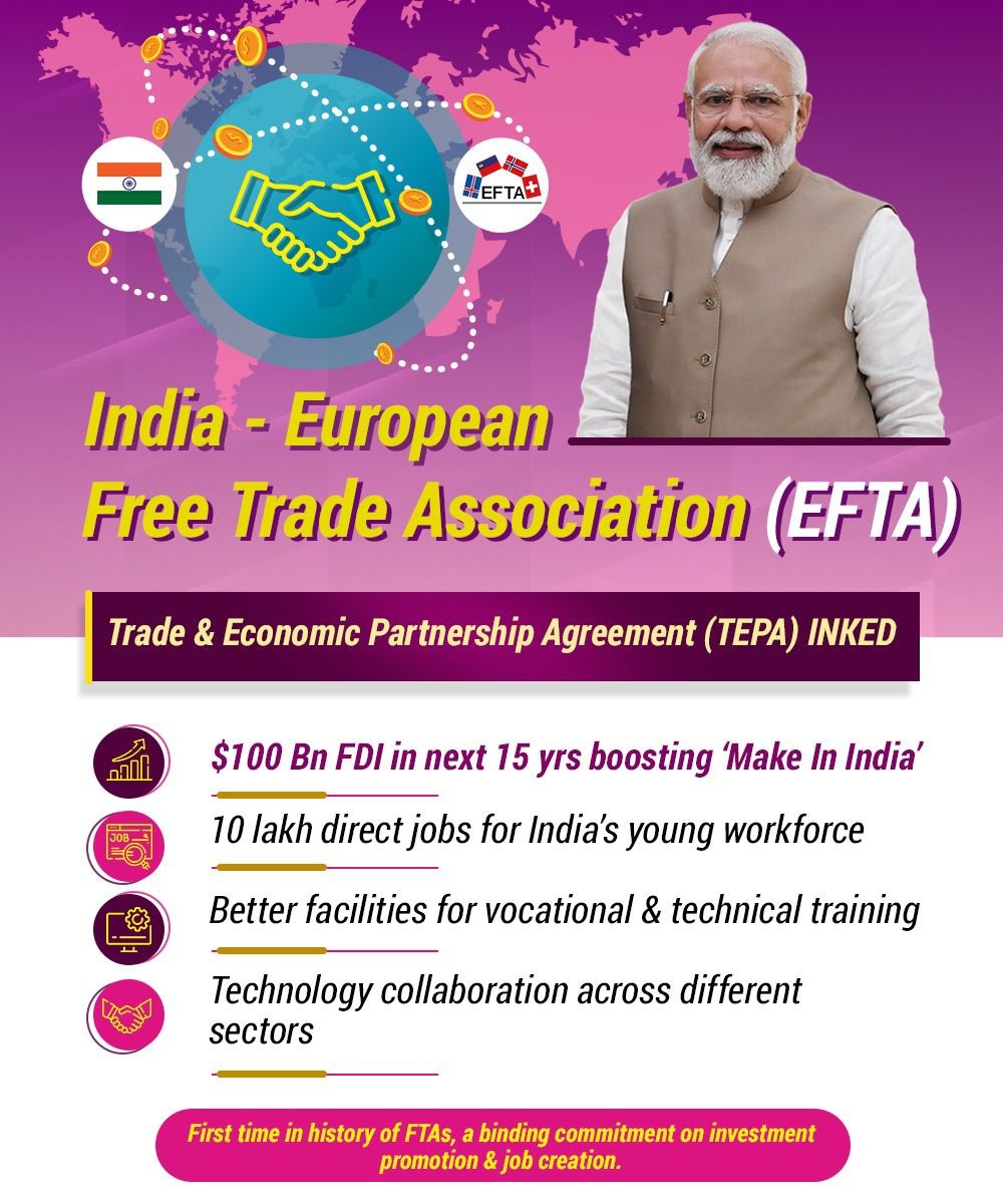 The India-EFTA Trade and Economic Partnership Agreement (TEPA) is a special deal that India made with four European countries: Switzerland, Norway, Iceland, and Liechtenstein, which are part of a group called the European Free Trade Association (EFTA). This deal is really important because it’s the first time India has made such an agreement with European countries, showing that India wants to do more business with countries in the west.