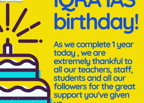 IQRA IAS celebrates it’s first anniversary today ie. 25th November 2019, we are extremely thankful to all our teachers, staff, students and all our followers for the great support you’ve given us.